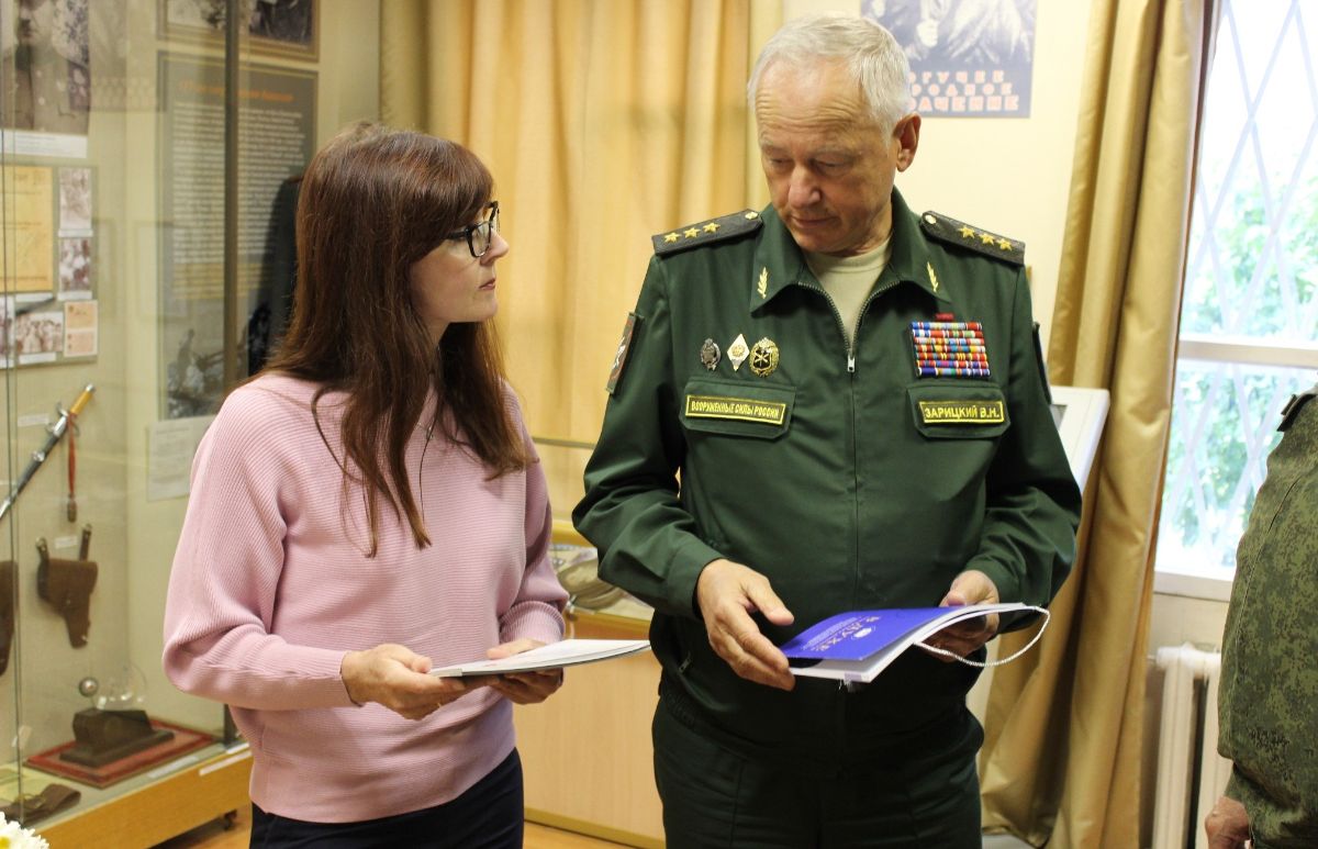 Генерал-полковник Владимир Зарицкий, в свою очередь, рассказал сотрудникам музея о работе Ассоциации, Благотворительного фонда «Воскресение», который занимается текущими вопросами по строительству Главного Храма Вооруженных Сил Российской Федерации в ознаменование 75-ой годовщины Победы в Великой Отечественной войне, созданию историко-мемориального мультимедийного комплекса «Дорога памяти» и Общероссийской патриотической акции «Мы – наследники Победы!».