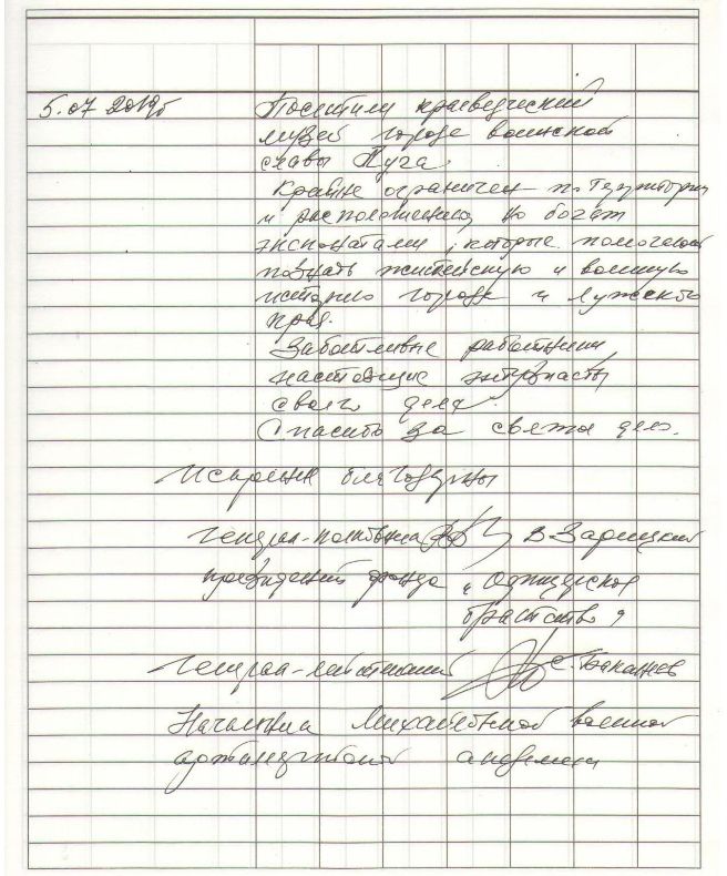 5 июля 2019 года в Лужском историко-краеведческом музее побывали заместитель председателя Правления Национальной Ассоциации «Мегапир», президент Фонда «ОФИЦЕРСКОЕ БРАТСТВО» генерал-полковник Владимир Зарицкий и начальник Михайловской военной артиллерийской академии генерал-лейтенант Сергей Баканеев.