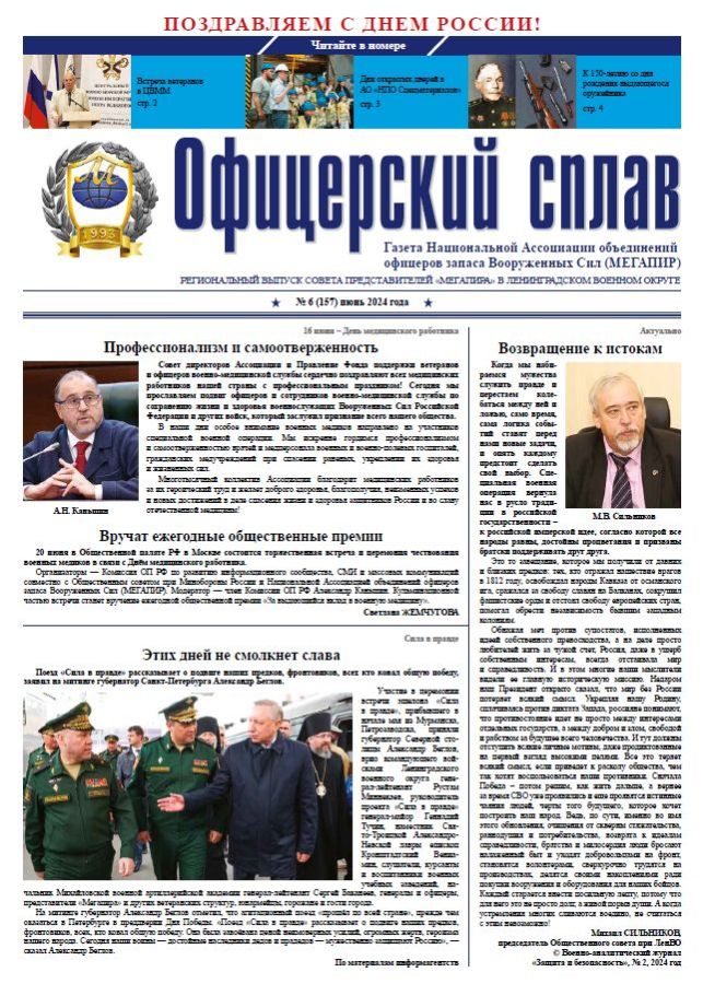 Вышел в свет региональный выпуск газеты «Офицерский сплав» в ЗВО (№06-2024). На его страницах вы узнаете об организационном собрании ветеранов политуправления и воспитательных структур ЛенВО (ЗВО), торжественных мероприятиях, посвящённых 130-летию со дня рождения русского и советского оружейника, выдающегося ученого в области космических исследований, дважды Героя Социалистического Труда, первого президента Академии артиллерийских наук генерал-лейтенанта Анатолия Аркадьевича Благонравова и многих других интересных материалах.