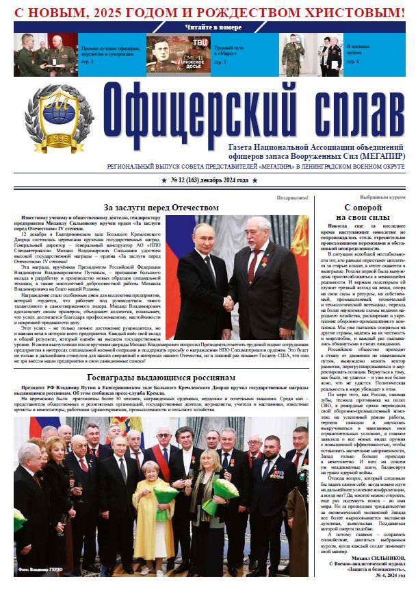 Вышел в свет региональный выпуск газеты «Офицерский сплав» в ЛенВО (№12-2024). На его страницах вы узнаете о вручении Президентом Российской Федерации Владимиром ПУТИНЫМ в государственных наград выдающимся россиянам, о подписании председателем Совета директоров Национальной Ассоциации «Мегапир» Александром КАНЬШИНЫМ Постановления «О Велиховском Форуме «Общественное признание», о проведении интеллектуальной игры «Кадетские баталии» в Санкт-Петербургском Пансионе воспитанниц Минобороны России и многих других интересных материалах.