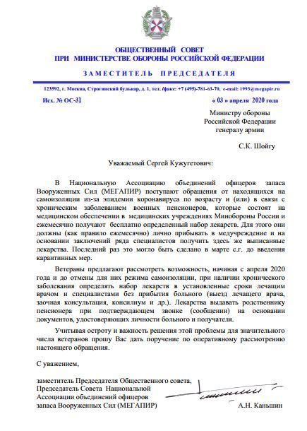 Каньшин отметил, что в Национальную ассоциацию объединений офицеров запаса Вооружённых сил (МЕГАПИР) поступают обращения от находящихся на самоизоляции из-за эпидемии коронавируса по возрасту и (или) в связи с хроническим заболеванием военных пенсионеров, которые прикреплены на обслуживание к медицинским учреждениях Минобороны России и ежемесячно получают бесплатно определенный набор лекарств.