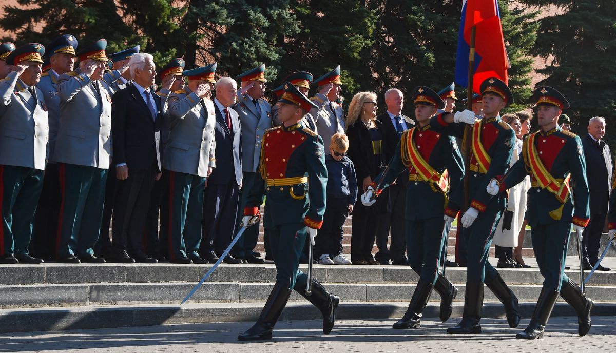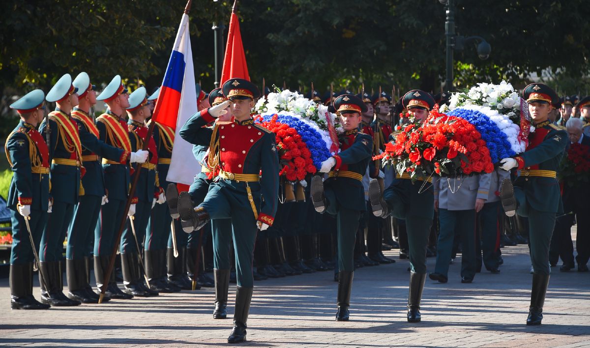 После минуты молчания под звуки военного марша парадный строй военнослужащих пронес Государственный Флаг и флаг Сухопутных войск по Аллее городов-героев и воинской славы в Александровском саду и перед участниками памятных мероприятий.