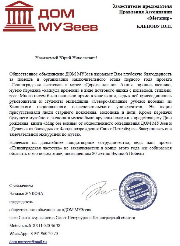 10 сентября 2024 в Представительство Национальной Ассоциации в Ленинградском военном округе поступило благодарственное письмо от Общественного объединения ДОМ МУЗеев заместителю председателя Правления – руководителю Представительства в ЛенВО полковнику Юрию КЛЁНОВУ за помощь в организации заключительного этапа первого года проекта «Ленинградская ласточка» в музее «Дорога Жизни».