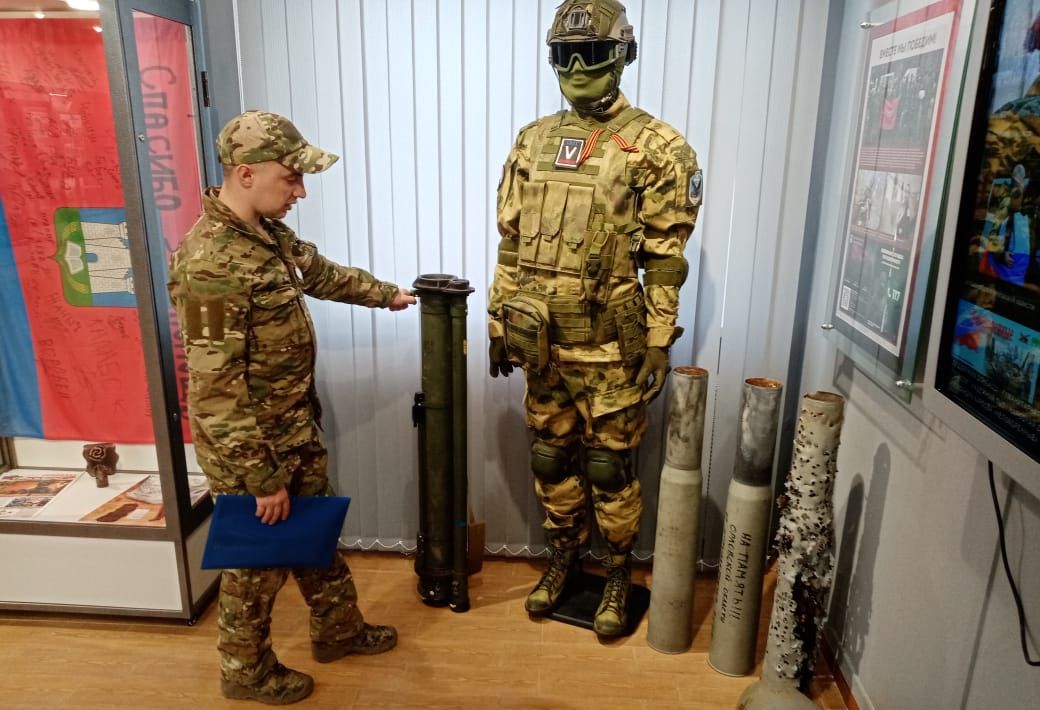 В зале, посвященном специальной военной операции, гости увидели ряд интересных экспозиционно-художественных комплексов. Среди экспонатов элементы обмундирования и снаряжения российских военнослужащих, трофеи, добытые ими в зоне СВО.