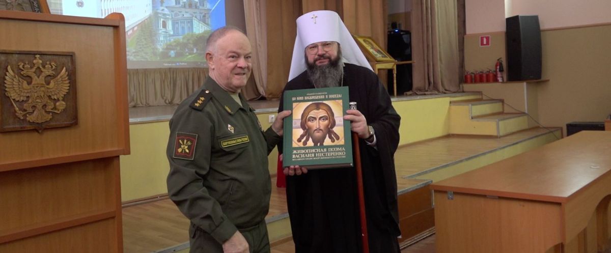 Член Правления – руководитель Представительства Национальной Ассоциации объединений офицеров запаса Вооруженных Сил (МЕГАПИР) в Смоленской области генерал-полковник Николай ФРОЛОВ вручил на память митрополиту Смоленскому и Дорогобужскому ИСИДОРУ книгу Андрея Панкратова «Во имя Воскресения и Победы. Живописная поэма Василия Нестеренко в Главном храме Вооруженных сил России».