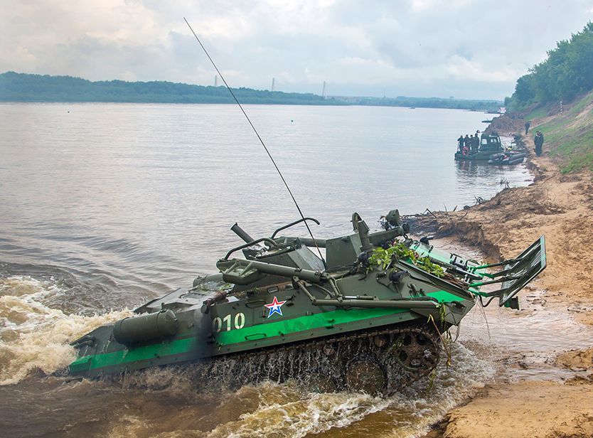 На следующем этапе экипажи плавающих транспортеров ПТС-2 преодолев препятствия: ограниченный поход с поворотом, проход в минном поле и др. совершили переправку на противоположный берег.