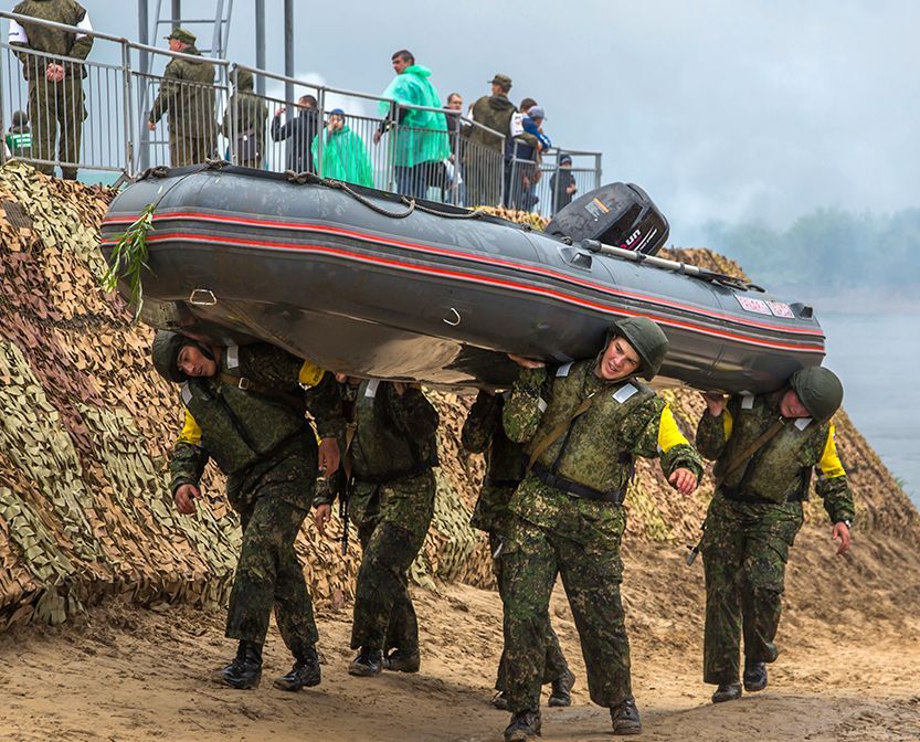В начале соревнования военнослужащие понтонных подразделений выполнили инженерную разведку водной преграды силами инженерно-разведывательного дозора на лодке ФАВОРИТ.